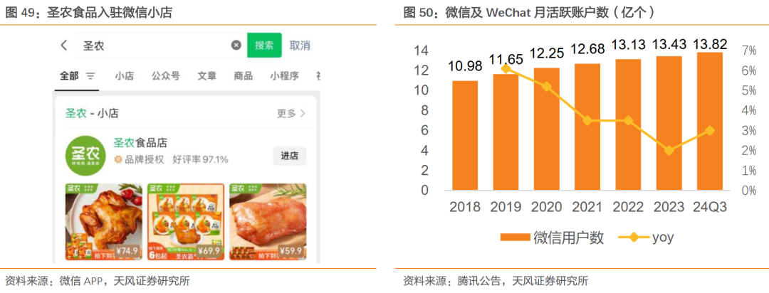 率先进驻微信小店,有望多维度受益于社交电商浪潮。公司于2023年1月上线微信小店“圣农食品店”,推出含脆皮炸鸡、嘟嘟翅等大单品在内的多款节日礼盒,产品单价在50-300元不等,契合节日送礼、家庭消费场景。截至2024年9月末,微信及WeChat的合并月活用户数13.82亿;我们认为,微信小店“送礼”功能有望盘活社交电商生态,为公司食品C端零售带来新增量;而产品研发实力与私域流量池的有效结合,亦有望助力加速开发更多大单品。