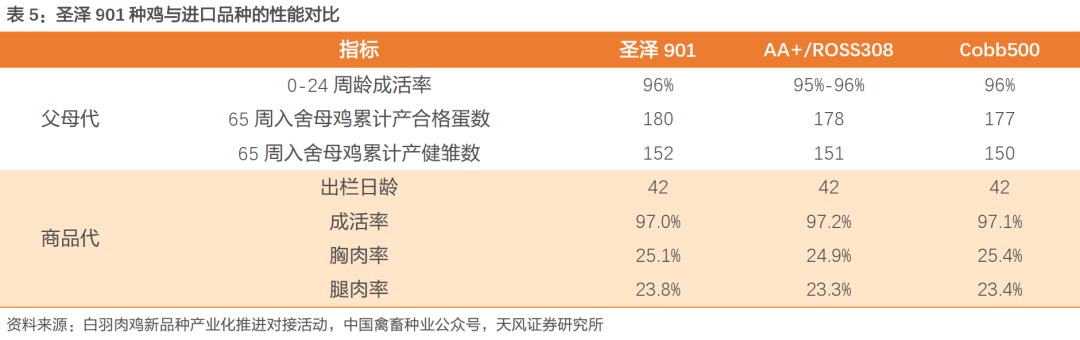 性能指标:“圣泽901”配套系本土适应性强,繁衍出的父母代种鸡产蛋率、受精率、孵化率高,商品代肉鸡饲料转化率高、出栏日龄低,综合效益和抗病能力均具备明显且稳定的优势。2023年12月,公司种鸡育种迭代升级至“圣泽901plus”,料肉比、产蛋率、生长速度、抗病4项指标均达国际领先水平。