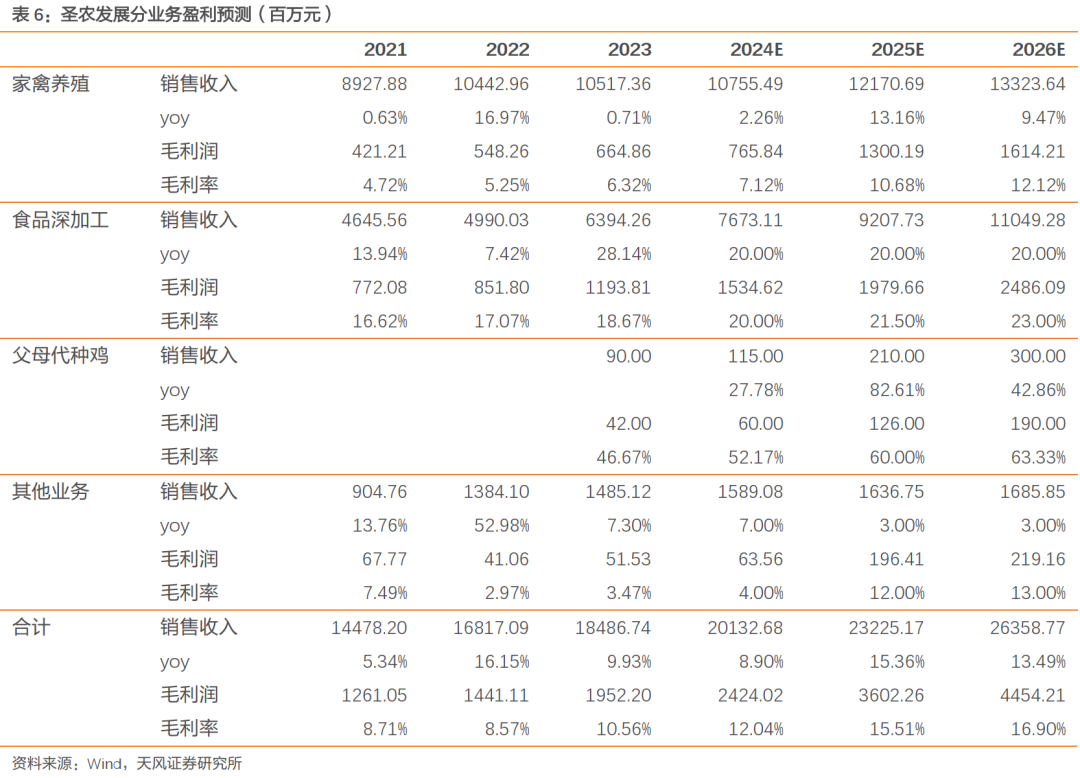 家禽养殖:海外引种持续受限,叠加促消费政策提振,预计后续价格有望景气上行;随着公司鸡舍建设升级、以及完成对太阳谷并表,预计肉鸡屠宰及产销有望持续上量;此外,新研发的“圣泽901plus”种鸡在养殖端逐步替换迭代,有望推动料肉比、综合造肉成本持续下降,带动单羽盈利提升。给予养殖业务2024-2026年11.3%复合年均增速。