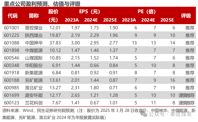 板块优质公司现金、股息价值强,估值有望提升。伴随板块2024年业绩持续发布,龙头及优质企业不仅表现出强大的业绩韧性和高股息属性,同时现金流表现亮眼。2024年,受煤价中枢下移影响,中国神华、兖矿能源归母净利润同比-1.7%/-28.4%,而经营净现金流同比 4.1%/ 38.2%,平煤股份受焦煤价格大幅下行影响利润同比下滑41.3%,而经营净现金流同比仅下滑6.3%,上述三家公司2024年度分红比例分别达到76.5%/53.6%/60.3%,股息率5.2%/5.4%/6.0%,体现出行业周期下行背景下,业绩稳健、强现金流所保障的高股息价值。3月26日,港交所披露易股权披露信息显示,瑞众保险以每股31.9153港元的均价买入100万股中国神华H股,耗资约3200万港元,增持后瑞众保险对其持股比例达到5%,触发举牌。我们认为,在弱需求及国债收益率持续下行背景下,看好高长协比例动力煤优质标的受益“稳盈利 低负债 高现金 高股息”属性所体现的防御价值,同时在保障股东回报基础上利用充沛现金低成本扩张,或在煤炭资源供给刚性下通过一级市场竞拍保障资源接续,从而兼具中长期成长属性,近期板块有望迎估值提升行情。