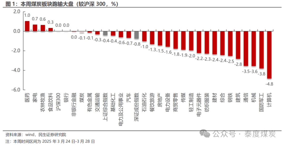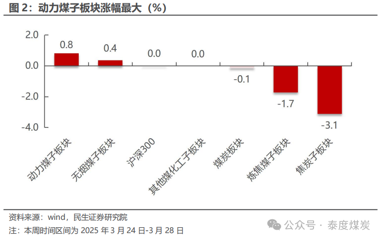 截至3月28日,本周中信煤炭板块周跌幅0.1%,同期沪深300周环比持平,上证指数周跌幅0.4%,深证成指周跌幅0.8%。