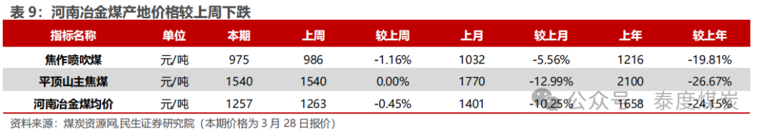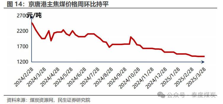 港口焦煤价格持平,产地焦煤价格涨跌互现。据煤炭资源网数据,截至3月28日,京唐港主焦煤价格为1380元/吨,周环比持平。截至3月27日,澳洲峰景矿硬焦煤现货指数为183.65美元/吨,周环比上涨4.05美元/吨。产地方面,山西低硫周环比上涨4元/吨,长治喷吹煤周环比下跌10元/吨,山西高硫、柳林低硫、灵石肥煤、济宁气煤周环比持平。