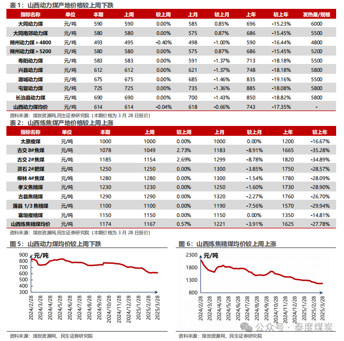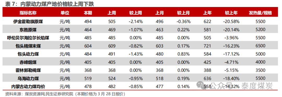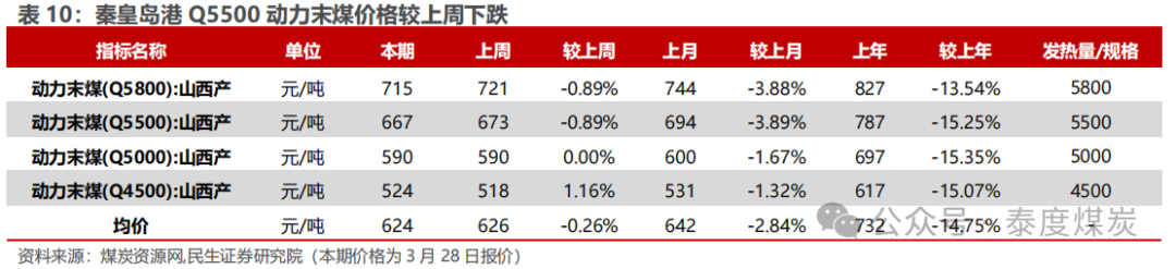 港口煤价小幅下滑,产地煤价涨跌互现。煤炭资源网数据显示,截至3月28日,秦皇岛港Q5500动力煤市场价报收于667元/吨,周环比下跌6元/吨。产地方面,据煤炭资源网数据,山西大同地区Q5500报收于550元/吨,周环比持平;陕西榆林地区Q5800指数报收于530元/吨,周环比上涨13元/吨;内蒙古鄂尔多斯Q5500报收于469元/吨,周环比下跌5元/吨。