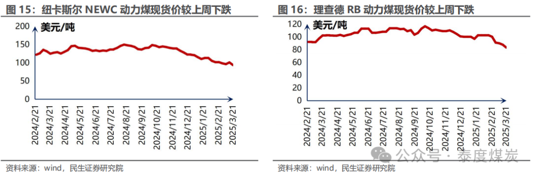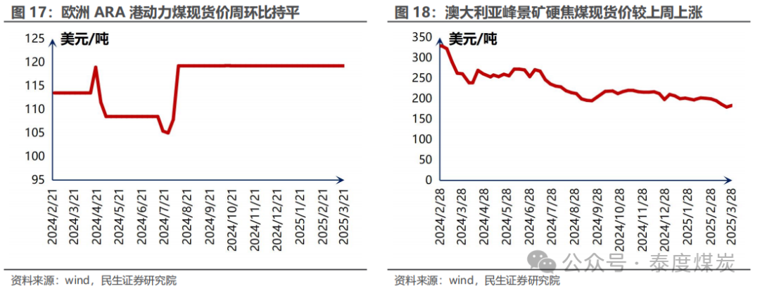 据Wind数据,3月21日,纽卡斯尔NEWC动力煤报收93.90美元/吨,较上周下跌7.12%;理查德RB动力煤均价报收83.30美元/吨,较上周下跌5.13%;欧洲ARA港动力煤均价报收119.25美元/吨,周环比持平。3月28日,澳大利亚峰景矿硬焦煤现货价报收183.5美元/吨,较上周上涨2.23%。