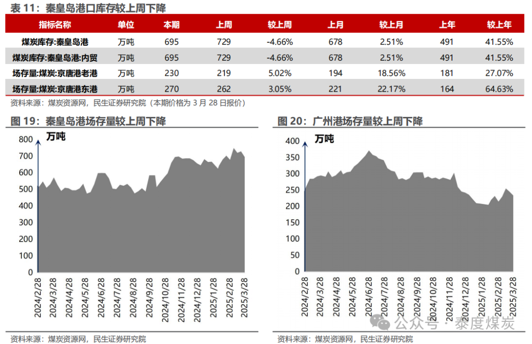 煤炭资源网数据显示,库存方面,秦皇岛港本期库存695万吨,较上周下降4.66%;广州港本期库存234万吨,较上周下降4.69%。