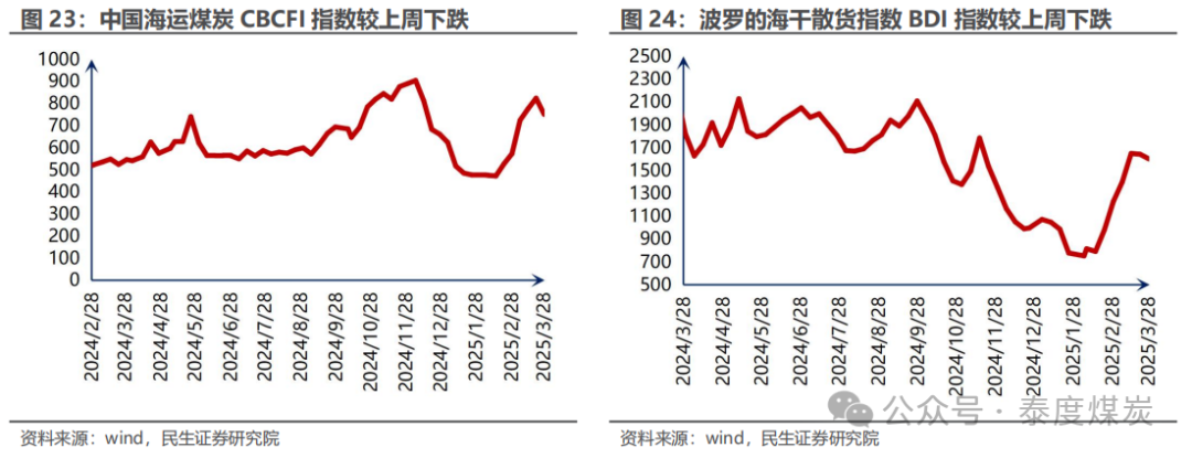 电厂周均日耗环比下降,可用天数增加,化工需求环比下降。据CCTD数据,3月27日二十五省的电厂日耗为476.6万吨,周环比下降21.7万吨,同比下降37.5万吨;周均日耗477.1万吨,周环比下降46.1万吨,同比下降51.4万吨;可用天数23.3天,周环比增加1.4天,同比增加2.5天。截至3月28日当周化工行业合计耗煤664.50万吨,同比增长8.9%,周环比下降1.5%。