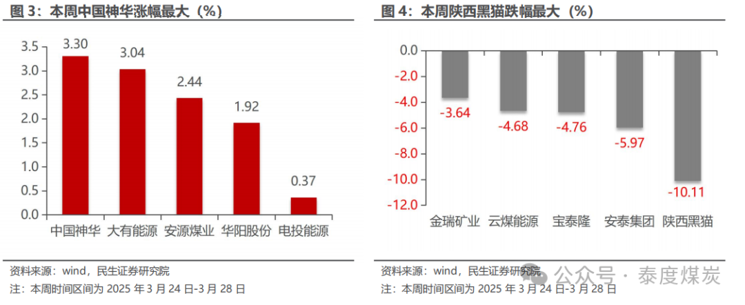 本周中国神华涨幅最大。截至3月28日,煤炭行业中,公司周涨跌幅前5位分别为:中国神华上涨3.30%,大有能源上涨3.04%,安源煤业上涨2.44%,华阳股份上涨1.92%,电投能源上涨0.37%。