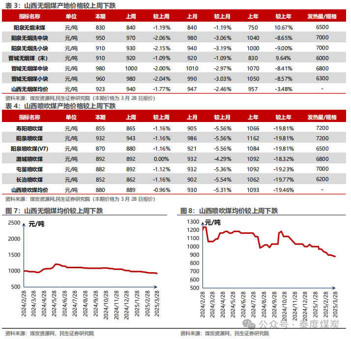 据煤炭资源网数据,山西无烟煤均价本周报收923元/吨,较上周下跌1.77%。山西喷吹煤均价本周报收880元/吨,较上周下跌0.96%。