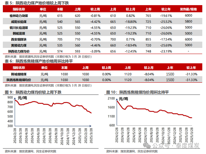 据煤炭资源网,陕西动力煤均价本周报收于574元/吨,较上周下跌3.09%。陕西炼焦精煤均价本周报收1030元/吨,周环比持平。