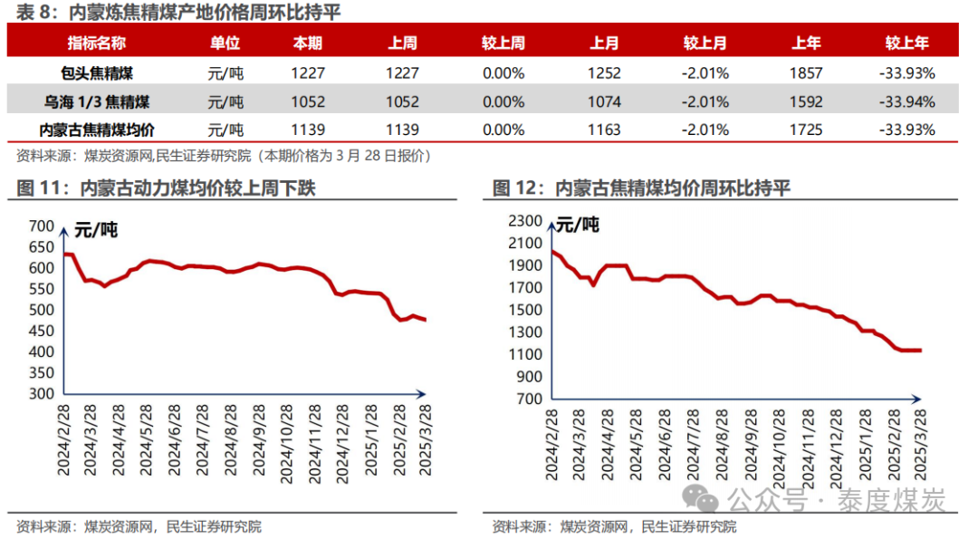 据煤炭资源网,内蒙动力煤均价本周报收478元/吨,较上周下跌0.85%。内蒙炼焦精煤均价本周报收1139元/吨,周环比持平。