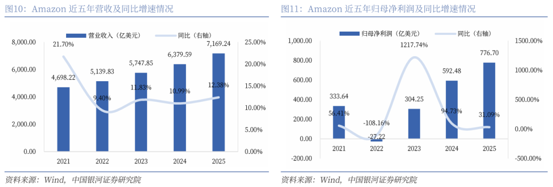 Amazon(AMZN)披露截至2025年12月31日的年度报告,公司全年实现总净销售额7169亿美元(YoY 12.38%),收入上升主要受AWS业务(净销售额1287亿美元,同比增长20%)、北美板块(净销售额4263亿美元,同比增长10%)及国际板块(净销售额1619亿美元,同比增长 13%)的推动。四季度,AWS业务季度营收增至356亿美元,同比增长24%,创13个季度以来最高增速。实现净利润776.70亿美元(YoY 31.09%),净利润同比增加主要受益于运营效率提升及投资收益增长。