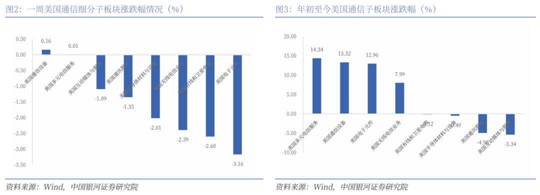 (二)一周美国通信子板块多数下跌,通信设备及多元电信服务逆势上涨