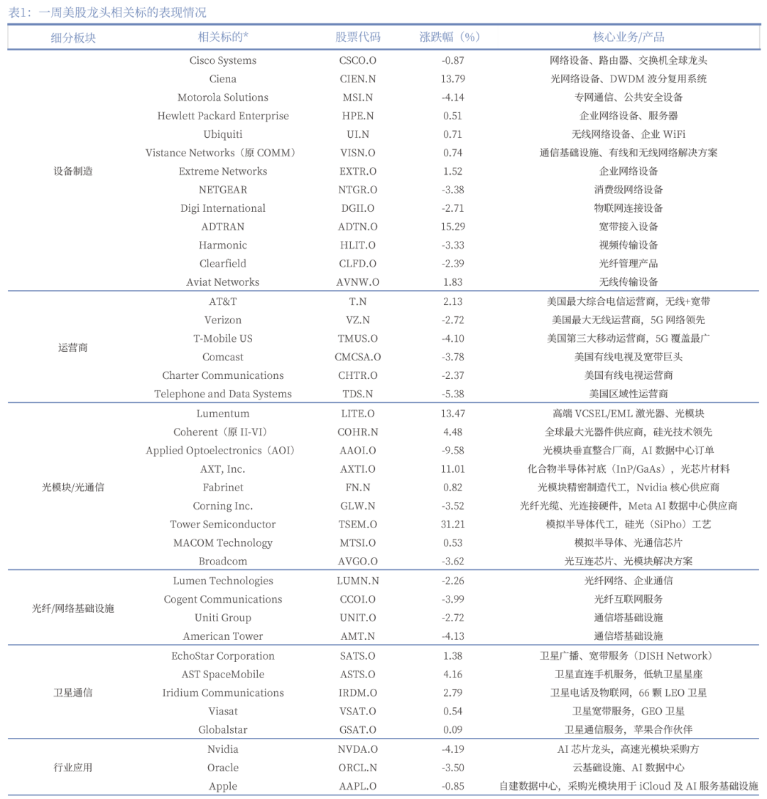 一、周市场行情:美股通信板块表现好于行业平均