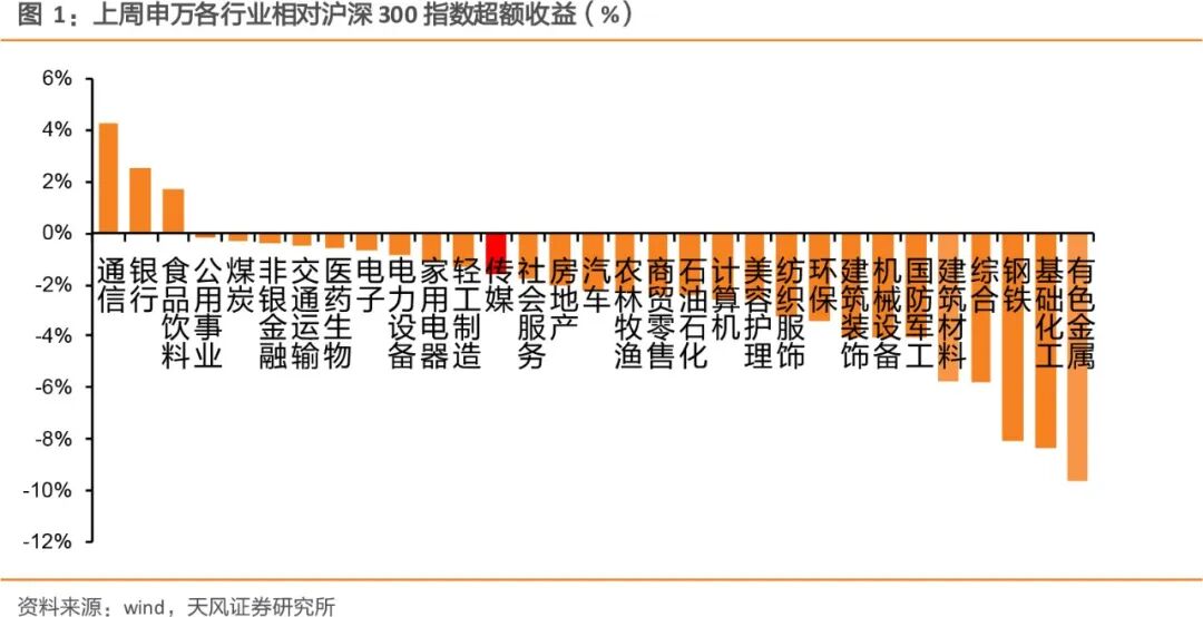 上周传媒(申万)指数整体下跌3.78%,同期沪深300指数整体下跌2.19%,板块跑输沪深300指数1.60%,位列所有板块第13位。