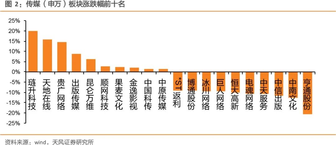 从个股看,琏升科技(20.06%)/天地在线(15.9%)/贵广网络(14.51%)/出版传媒(8.67%)/昆仑万维(6.16%) 领 涨 。亨通股份(-20.76%)/ 中南文化(-12.69%)/ 中信出版/(-11.71%)/中天服 务(-10.76%)/电魂网络 (-10.6%)领跌。