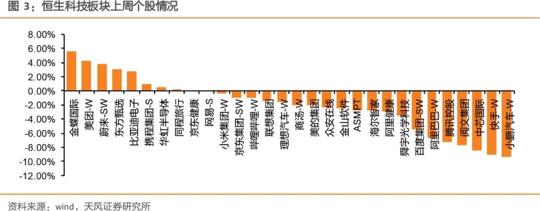 上周港股互联网科技板块涨跌幅:金蝶国际(5.61%)/美团-W(4.21%)/蔚来-SW(3.84%)/东方甄选(3.1%)/比亚迪电子(2.78%)领涨。小鹏汽车-W(-9.37%)/快手-W(-9.04%)/中芯国际(-8.52%)/闵文集团(-7.73%)/腾讯控股(-7.21%)领跌。