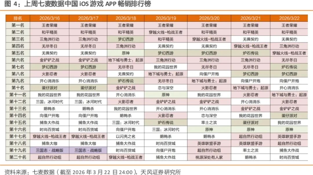 根据七麦数据,2026 年 3 月 16 日至 3 月 22 日中国 iOS 游戏畅销榜显示,腾讯系产品依旧占据绝对优势,《王者荣耀》本周表现强势,多次位居榜首,《和平精英》也稳居前列。中腰部产品方面,《火影忍者》、《英雄联盟手游》均出现一定波动,《桃源深处有人家》上周进入前二十。