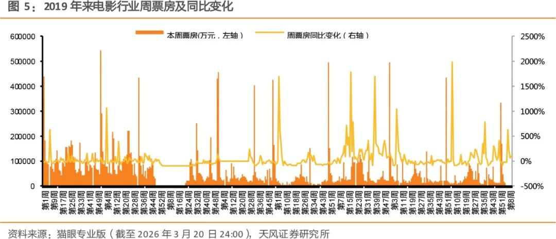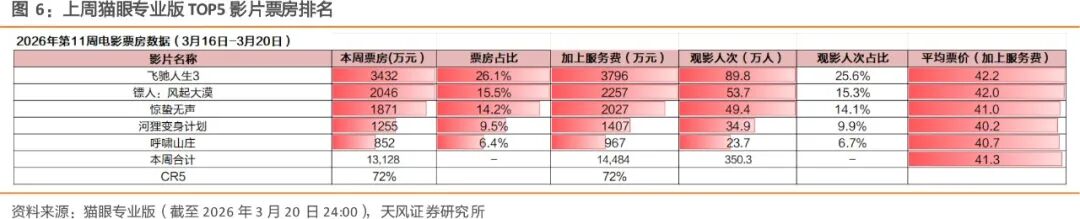 根据猫眼专业版票房排名,2026.3.16-2026.3.20(周一到周五)院线上映电影 TOP5 分别为《飞驰人生 3》、《镖人:风起大漠》、《惊蛰无声》、《河狸变身计划》、《呼啸山庄》,五部影片票房(不含服务费)分别 3432 万/2046 万/1871 万/1255 万/852 万,当周票房比例分别 26.1%/15.5%/14.2%/9.5%/6.4%。