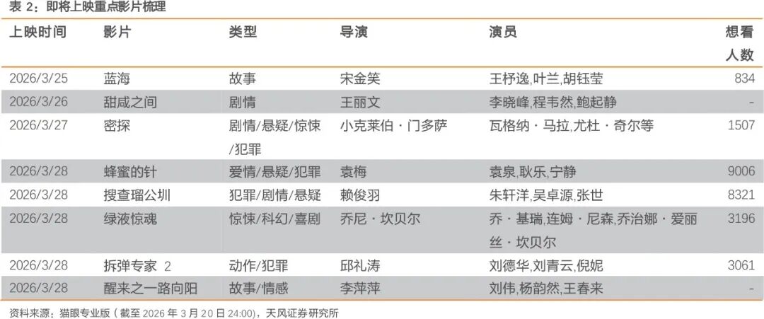 根据猫眼专业版,2026.3.22-2026.3.28 待上映的影片包括《蓝海》、《甜咸之间》、《密探》、《蜂蜜的针》、《搜查瑠公圳》、《绿液惊魂》、《拆弹专家 2》、《醒来之一路向阳》等。