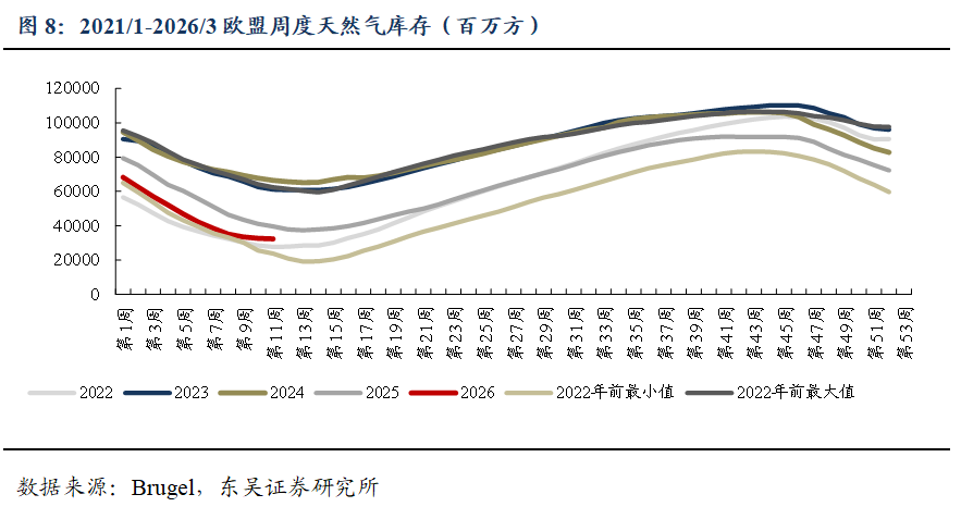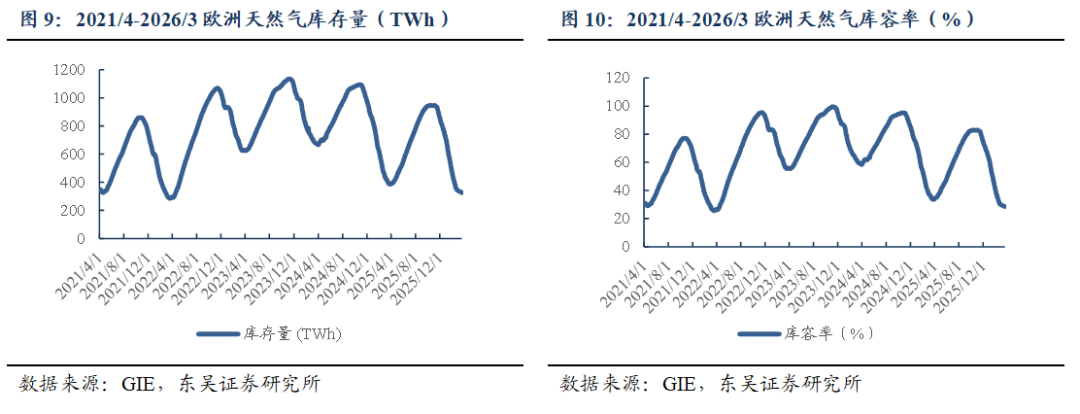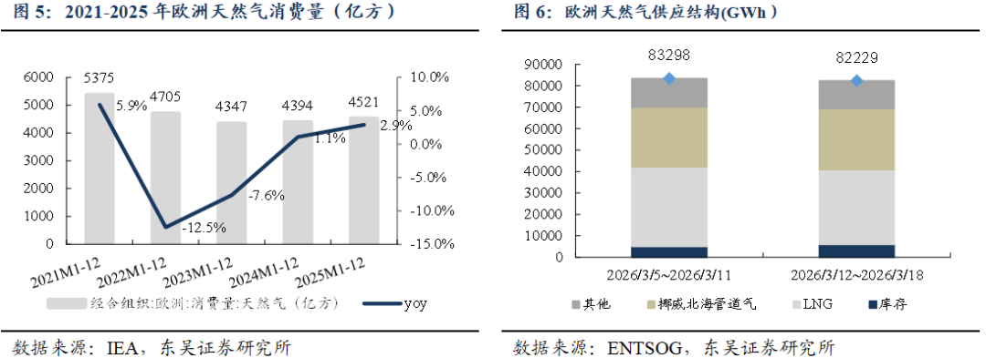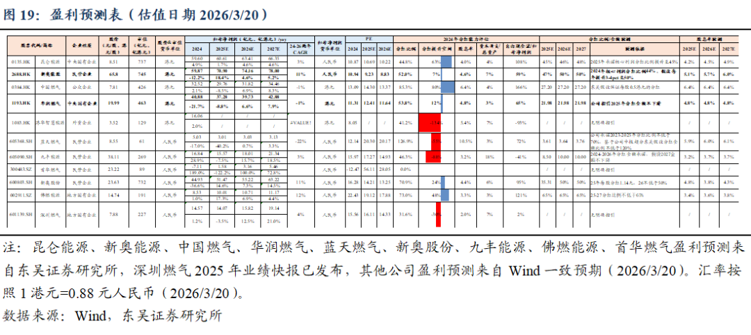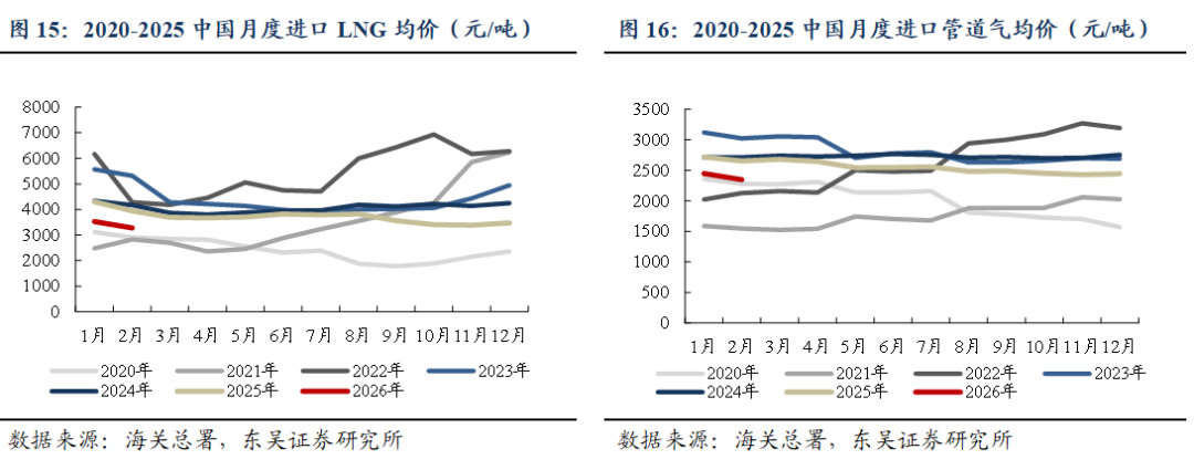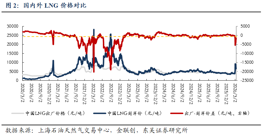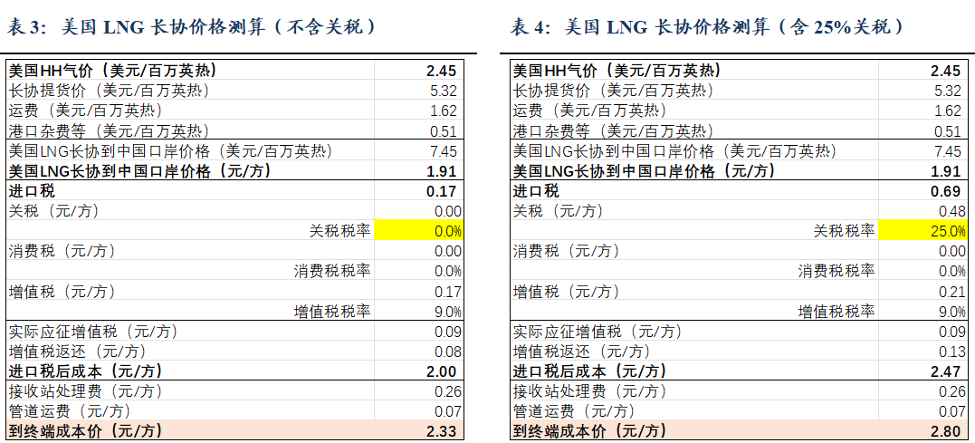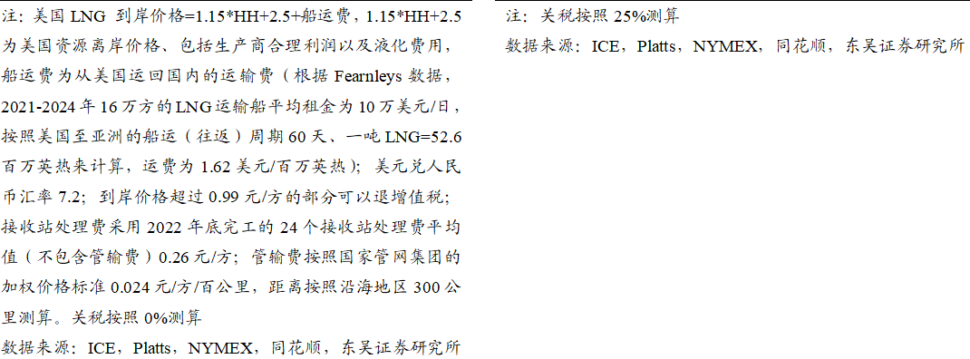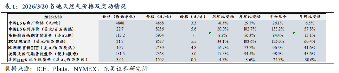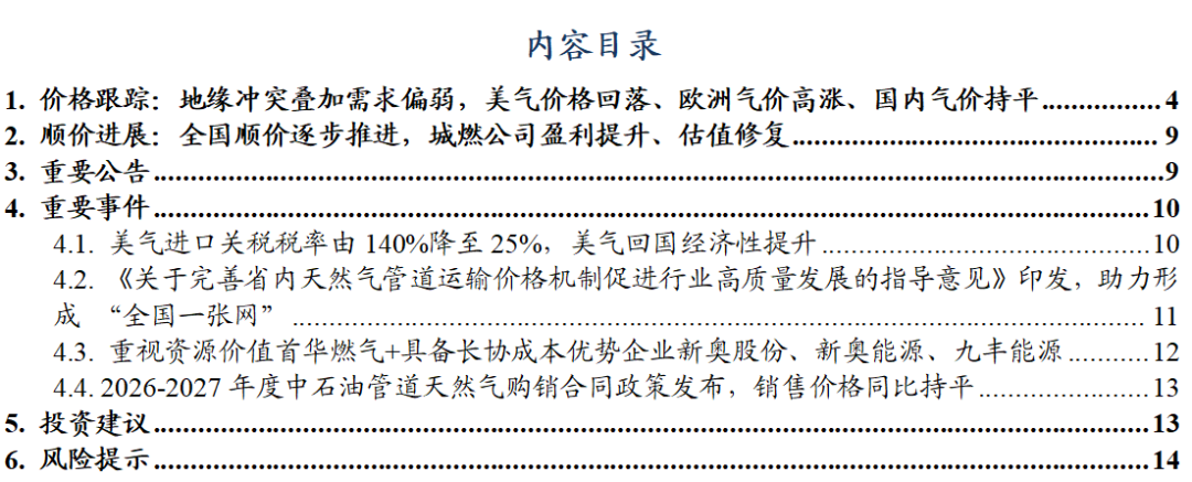 截至2026/03/20,美国HH/欧洲TTF/东亚JKM/中国LNG出厂/中国LNG到岸价周环比变动-4.7%/ 16.7%/ 34.1%/-0.3%/ 20%至0.7/4.8/5.5/3.3/5.6元/方。 ![]() ![]() ![]() 地缘冲突推高出口需求&采暖需求下降,美国天然气市场价格周环比-4.7%。截至2026/03/13,储气量周环比 350亿立方英尺至18830亿立方英尺,同比 10.3%。 ![]() 地缘冲突持续,欧洲气价周环比 16.7%。2025M1-12,欧洲天然气消费量为4521亿方,同比 2.9%。2026/3/12~2026/3/18,欧洲天然气供给周环比-1.3%至82229GWh;其中,来自库存消耗5986GWh,周环比 20%;来自LNG接收站34783GWh,周环比-6.1%;来自挪威北海管道气28410GWh,周环比 1.9%。2026/03/14~2026/03/20,欧洲燃气发电出力下降,欧洲日平均燃气发电量周环比-10.2%、同比-12.8%至865.3GWh。截至2026/03/20,欧洲天然气库存326TWh(315亿方),同比-62.6TWh;库容率28.51%,同比-5.4pct,周环比-0.5pct。 ![]() ![]() ![]() ![]() 地缘冲突推涨LNG到岸价&需求偏弱,国内气价持平,周环比-0.3%。2026M1-2,我国天然气表观消费量同比 0.8%至709亿方。2026M1-2,产量同比 3.1%至446亿方,进口量同比-1.4%至280亿方。2026年2月,国内液态天然气进口均价3269元/吨,环比-7.4%,同比-17%;国内气态天然气进口均价2345元/吨,环比-4.2%,同比-11.6%;天然气整体进口均价2763元/吨,环比-10.2%,同比-15.4%。截至2026/03/20,国内进口接收站库存382.36万吨,同比 12.96%,周环比 8.44%;国内LNG厂内库存75.76万吨,同比 42.14%,周环比-2.56%。 ![]() ![]() ![]() ![]() ![]() 2022~2026M2,全国68%(197个)地级及以上城市进行了居民顺价,提价幅度为0.22元/方。2024年龙头城燃公司价差在0.53~0.54元/方,2025H1普遍修复0.01元/方,结合我们此前在报告《对比海外案例,国内顺价政策合理、价差待提升》中的测算,城燃配气费合理值在0.6元/方以上,价差仍存10%修复空间,顺价仍将继续落地。 ![]() ![]() ![]() 4. 重要事件 4.1. 美气进口关税税率由140%降至25%,美气回国经济性提升 2025/2/4,国务院关税税则委员会发布关于对原产于美国的部分进口商品加征关税的公告。《公告》提到自2025年2月10日起,对原产于美国的部分进口商品加征关税,其中,对液化天然气加征15%关税。2025/4/2,经国务院批准,自2025年4月10日12时01分起,对原产于美国的所有进口商品,在现行适用关税税率基础上加征34%关税,随后进一步宣布增加到140%。2025/5/12商务部发布中美日内瓦经贸会谈联合声明指出修改税委会公告2025年第4号规定,其中,24%的关税在初始的90天内暂停实施、10%关税保留,并取消第5、6号对这些商品的加征关税。美气进口关税税率由140%降至25%。 2025/8/12宣布继续维持25%关税税率90天。2025/11/10起继续维持25%关税税率一年。 参考入库报告《自2/10起对美LNG加征15%关税,美LNG进口占比有限,加关税后仍具成本优势》,2024年美国LNG长协到达沿海地区终端用户的成本叠加25%关税将达2.80元/方,在沿海地区仍具0.08~0.55元/方的价格优势,价格优势显现。2024年中国自美国进口LNG约416万吨,占LNG进口总量约5.4%,占全国表观消费量约1.4%;占比较小,对整体供给影响有限。 ![]() ![]() 4.2. 《关于完善省内天然气管道运输价格机制促进行业高质量发展的指导意见》印发,助力形成“全国一张网” 2025 年 8 月 1 日,国家发展改革委、国家能源局印发了《关于完善省内天然气管道运输价格机制促进行业高质量发展的指导意见》。该政策旨在加强自然垄断环节价格监管,提升天然气管道运输效率,促进行业高质量发展。 《意见》提到,省内各级天然气管道(不含企业内部自用管道)运输价格由省级发展改革部门制定,原则上不再下放定价权限;对于已纳入国家统一定价的跨省天然气管道系统省内段及配套支线,省级发展改革部门不再重复定价,助力形成“全国一张网”。有助于规范定价管理,避免多头定价和价格混乱。《意见》统一规范定价模式,按照 “准许成本加合理收益” 的方法核定省内天然气管道运输价格,通过严格成本监审,确定准许成本、准许收益和输气量等因素来核定价格。明确天然气管道资产折旧年限原则上为40 年,准许收益率不高于 10 年期国债收益率加 4 个百分点,核定输气量应设置不低于 50% 的最低负荷率等定价参数。同时,价格监管周期原则上为3 年,若监管周期内相关资产、成本、输气量等发生重大变化,可提前校核,使价格更能反映成本和市场情况,既保障企业合理收益,又防止价格过高。此前各省的定价原则为准许收益率不高于7%/8%,最低负荷率50%/60%,按照2026年3月20日的10 年期国债收益率(1.83%)计算,新标准的准许收益率上限和最低负荷率均高于各省现有水平,体现出降管输费、放低负荷率要求的趋势。 数据来源:https://www.ndrc.gov.cn/xwdt/tzgg/202508/t20250801_1399578.html 4.3. 重视资源价值首华燃气 具备长协成本优势企业新奥股份、新奥能源、九丰能源 1)事件:2026年2月28日美伊冲突爆发导致霍尔木兹海峡封锁,对三大天然气指数的影响程度排序:JKM(亚洲)>TTF(欧洲)>HH(美国)。霍尔木兹海峡封锁对JKM和TTF产生直接影响,影响亚洲13%的供给,影响欧洲3%的供给。对HH产生间接影响(霍尔木兹海峡封锁后美气出口需求提升)。 复盘2025年6.13-6.24伊以冲突高强度互袭,霍尔木兹海峡未被封锁,仅短暂避险,期间各气价大涨(事件结束后回落)。JKM:冲突期间涨幅11.2%(1.4美元/MMBtu);TTF:冲突期间涨幅3.2%(0.4美元/MMBtu);HH:冲突期间涨幅13.8%(0.4美元/MMBtu);布油:冲突期间涨幅达7%。 2026/3/20,HH/TTF/JKM/布油比2026/2/27变动 1.5%/ 76.0%/ 102.4%/ 