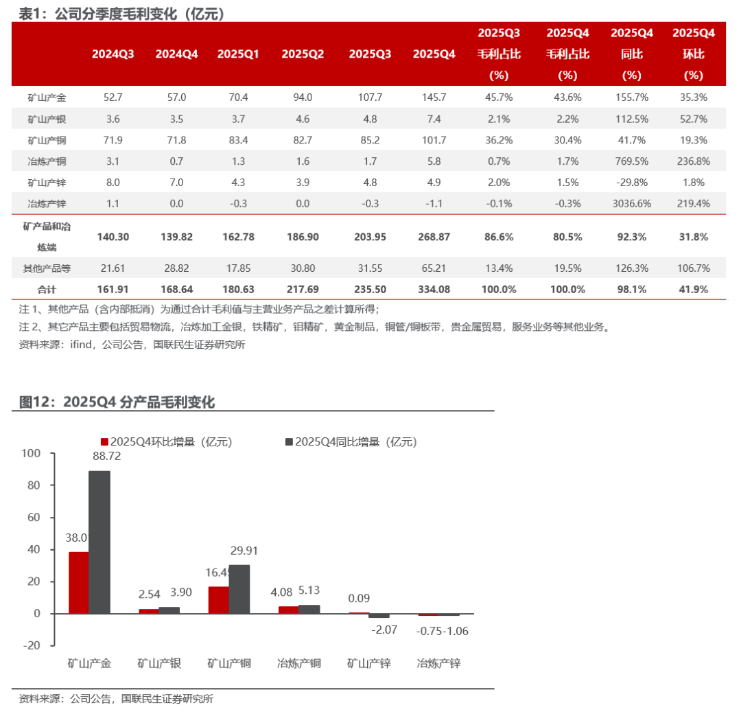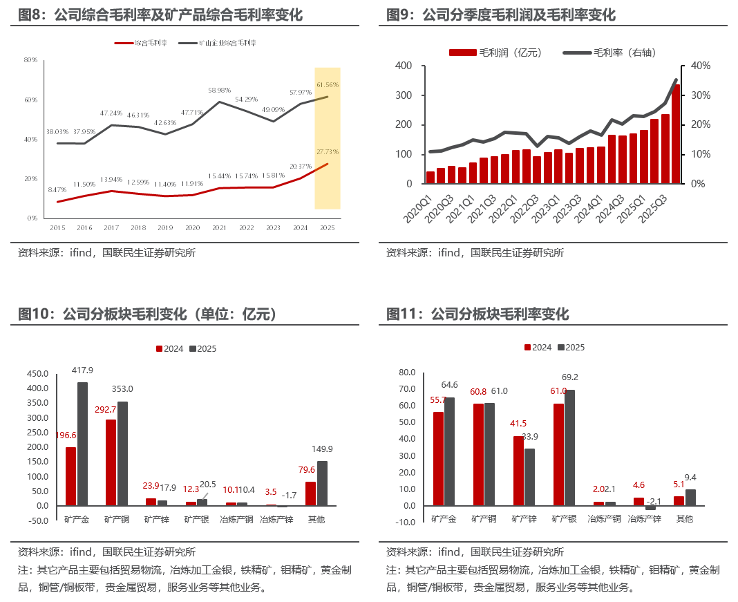 整体来看,1)2025年公司毛利润同比增长349.26亿元,综合毛利率同比增7.36pct至27.73%。2)分季度看,2025Q4公司单季度毛利润同比增98.1%、环比增41.9%至334.08亿元,毛利率同比增12.2pct、环比增8.0pct至35.21%。我们认为,公司2025年毛利润同比大幅增长主要得益于铜金等主要产品量价齐升。铜金板块毛利分别同比增长60.31、221.28亿元。2025年综合毛利率同比增长3.59pct,主要是由于高毛利的矿山端毛利占比提升。