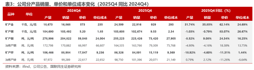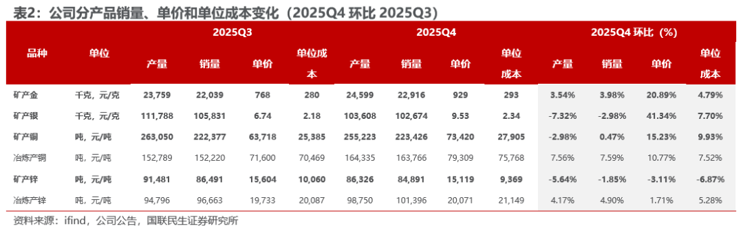 销量端:2025Q4,矿产金、矿产银、矿产铜、矿产锌销量环比分别变化 3.98%、-2.98%、 0.47%、-1.85%,整体销量环比变化不大。