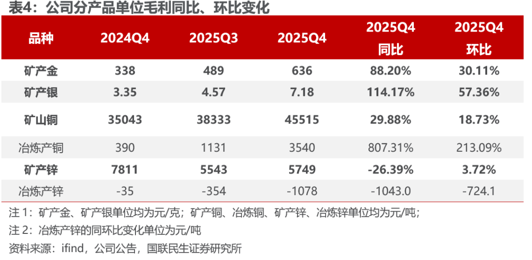 2025Q4矿产品及冶炼端毛利环比增长64.91亿元,其中,矿产金/铜Q4毛利环比分别增长38.01和16.45亿元,此外矿产银和矿产锌毛利环比增长2.55、0.09亿元,冶炼端冶炼铜毛利环比有所回升,毛利环比增长4.08亿元,冶炼锌毛利环比减少0.75亿元。