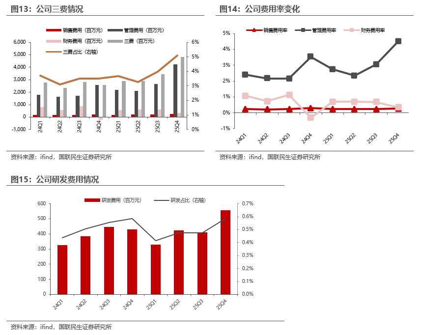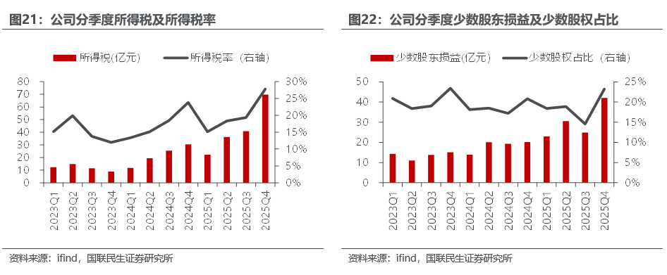 从期间费用的变化来看,2025Q4公司三费环比增加13.95亿元,主要是由于管理费用环比增加15.97亿元。2025年公司销售费用、管理费用、财务费用、研发费用分别为8.5、111.6、20.8、17.1亿元。2025年同比来看:变化较大的主要是管理费用同比增加34.3亿元,主要是由于并表企业增加,且公司效益较好,人员薪酬增加。分季度看,2025Q4期间费用(含研发费用)合计53.9亿元,环比增加15.4亿元,其中销售费用、管理费用、财务费用、研发费用分别环比变化 0.64亿元、 15.97亿元、-2.66亿元、 1.44亿元。其中管理费用环比大幅增长主要或由于年底人员奖金等增加,符合季节性的变化规律,财务费用环比减少主要或由于负债率下降,利息支出减少。