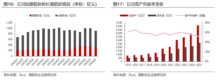 2025年公司持续偿还借款,年底资产负债率较2024年年底下降3.6 pct至51.6%。2024Q4末公司借款总额同比减少93.72亿至908.58亿元,其中短期借款323.54亿元,同比增长16.4亿,环比减少44.7亿元,长期借款585.04亿元,同比减少29.5亿,环比减少49.0亿元;公司2025年底资产负债率为51.6%,连续两年下滑,债务压力持续缓解。