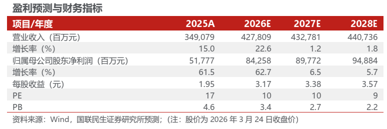 考虑到公司铜金产量持续增长,铜金价格上涨,我们预计2026-2028年公司将实现归母净利843亿元、898亿元、949亿元,对应3月24日收盘价的PE为10x、10x和9x,维持“推荐”评级。