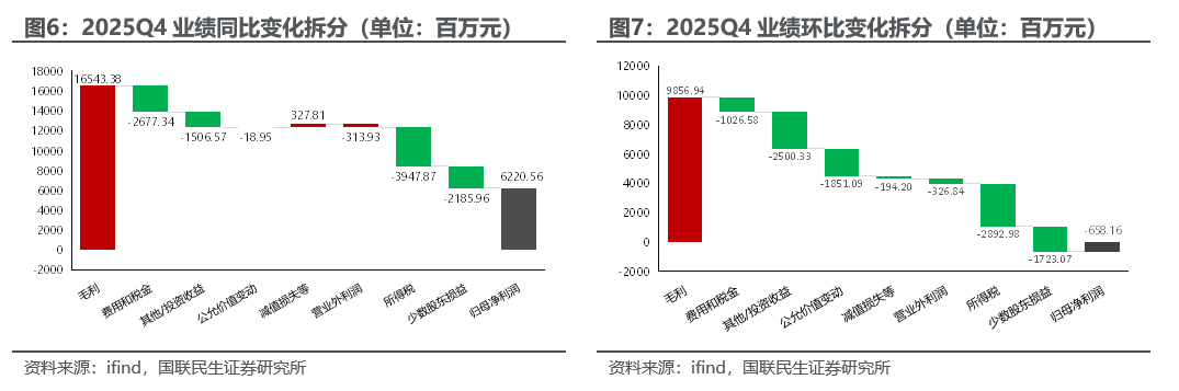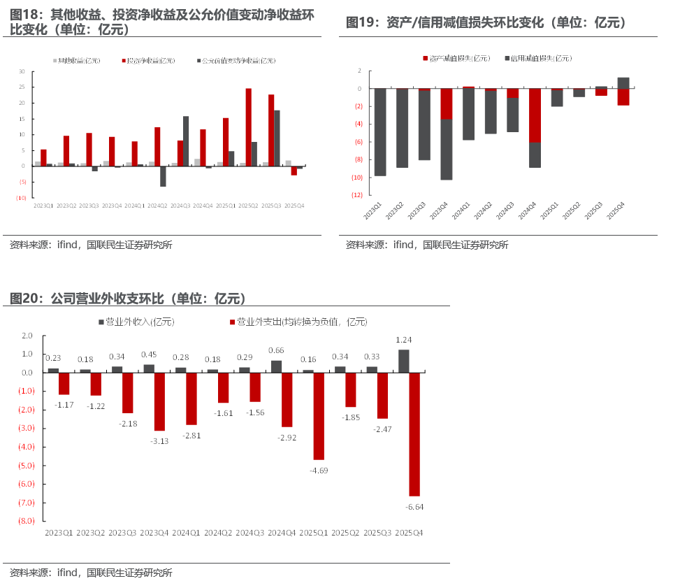 2025Q4公司非经常性利润(其他收益 投资净收益 公允价值变动净收益)环比减少46.89亿元(其中投资净收益环比减少43.51亿元,主要系金融资产处置收益环比减少),资产/信用减值损失环比减利0.10亿元,此外,营业外收支环比减利3.27亿元。综合来看,环比减利46.89亿元。