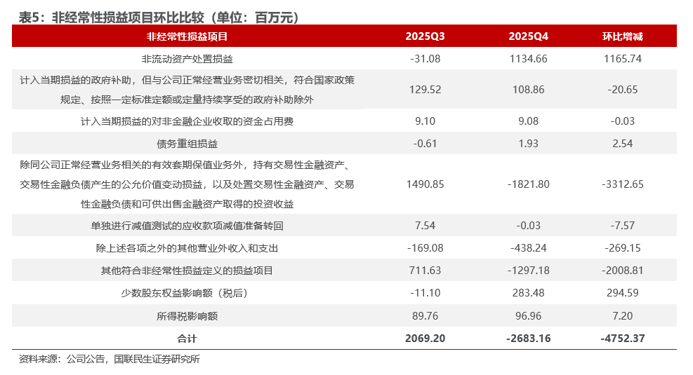 详细来看,2025Q4非经常性损益项目环比增量主要体现在:非流动资产处置损益( 11.66亿元),2025Q4环比的减量体现在:计入当期损益的政府补助(-0.21亿元),除同公司正常经营业务相关的有效套期保值业务外的公允价值变动损益和投资收益(-33.13亿元),单独进行减值测试的应收款项减值准备转回(-0.08亿元),除上述各项之外的其他营业外收入和支出(-2.69亿元),其他符合非经常性损益定义的损益(-20.09亿元),少数股东权益影响(-2.95亿元),所得税影响额(-0.07亿元)。