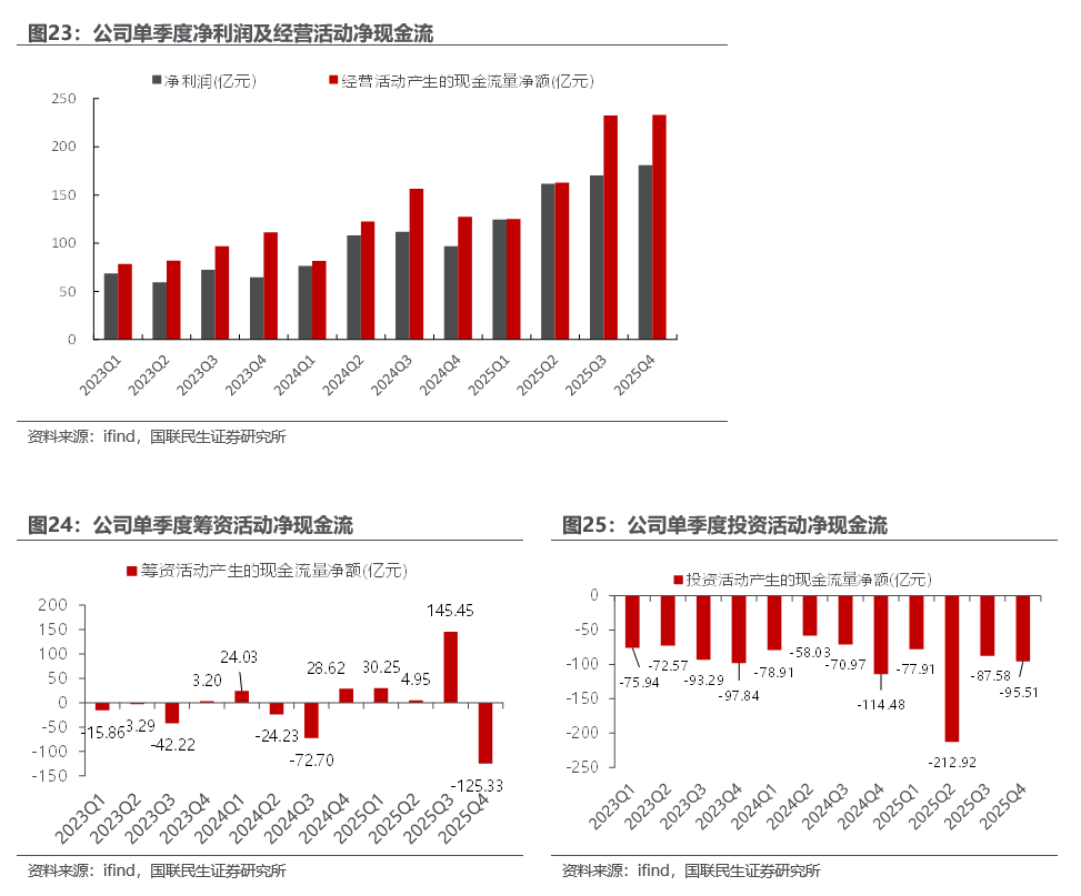 2025Q4公司投资活动产生的现金净流出为95.51亿元,上年同期为现金净流出114.48亿元,主要系正常项目投建资金需求。