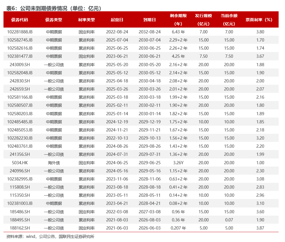 2025Q4公司筹资活动产生的现金净流出额为125.33亿元,上年同期为现金净流入额28.62亿元。根据公司未到期债务情况,预计2026年或存在债券债务预计兑付约5亿元偿还需求,基于公司的现金流情况,我们认为公司的资金压力较小。