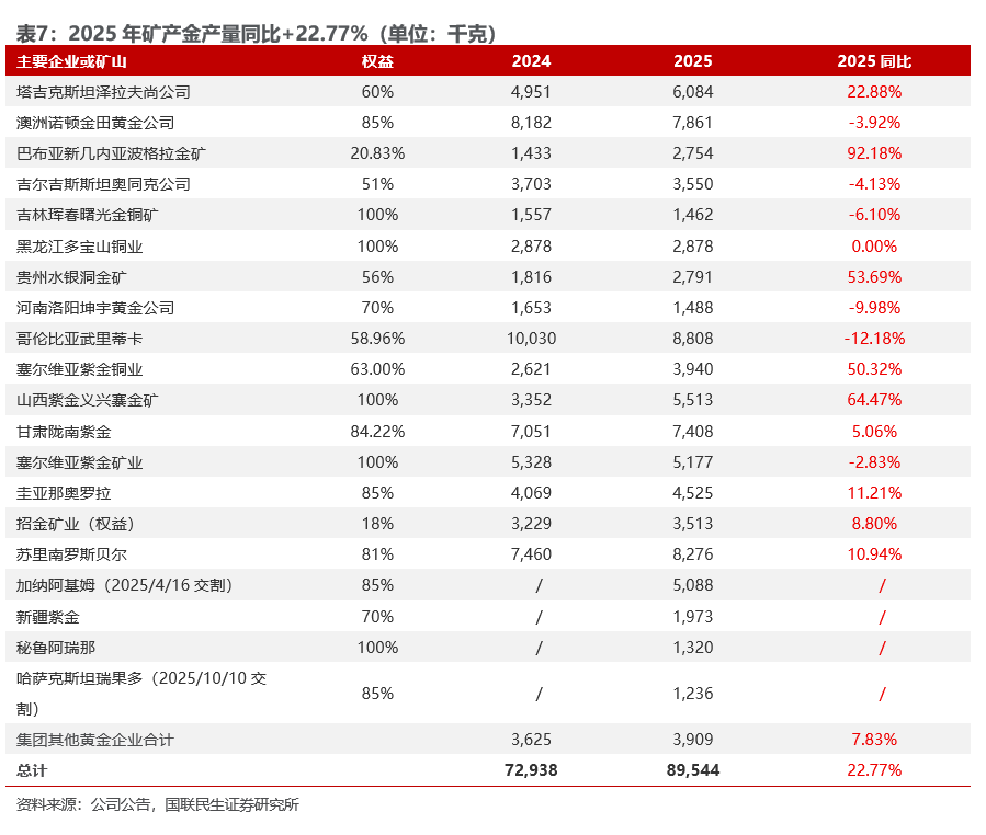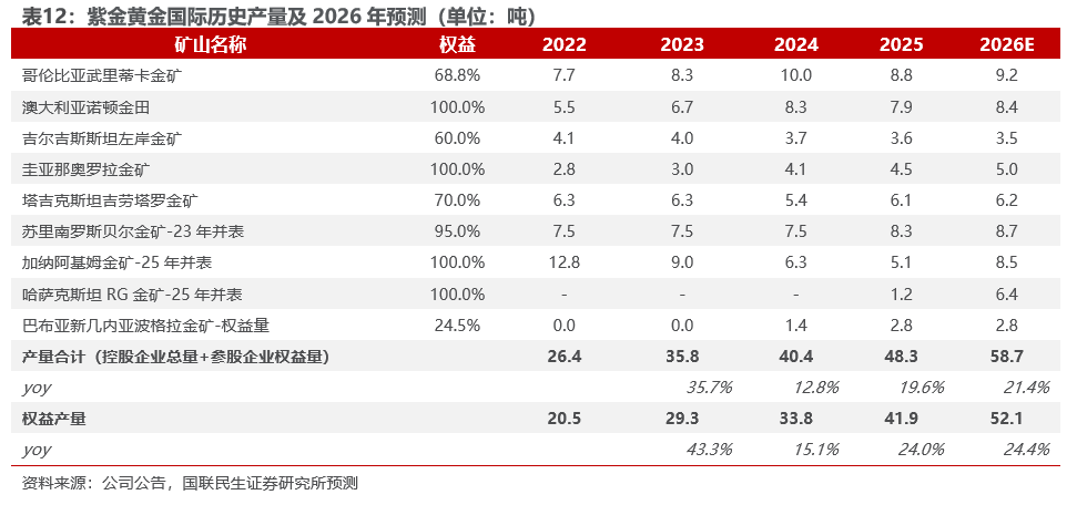 2025矿产金产量89.54吨,同比增长22.77%,25年公司矿产金年度目标是85吨,25年完成年度规划目标的105.34%。2025年,诺顿金田(同比-0.32吨,下同)、哥伦比亚武里蒂卡(-1.22吨)、吉尔吉斯斯坦奥同克(-0.15吨)、吉林珲春曙光金铜矿(-0.1吨)、河南洛阳坤宇(-0.17吨)、塞尔维亚紫金矿业(-0.15吨)同比减量,泽拉夫尚( 1.13吨)、波格拉金矿( 1.32吨)、贵州水银洞( 0.98吨)、塞尔维亚紫金铜业( 1.32吨)、山西紫金( 2.16吨)、苏里南罗斯贝尔金矿( 0.82吨)、陇南紫金( 0.36吨)、奎亚那奥罗拉( 0.46吨)等其他矿山贡献增量。同时,加纳阿基姆( 5.09吨)、新疆紫金( 1.97吨)、秘鲁阿瑞那( 1.32吨)、哈萨克斯坦瑞果多( 1.24吨)等新项目也贡献不错增量。加纳阿基姆金矿2026 年计划矿产金8.5吨,项目远期整体采选规模有望提高至1300万吨/年,达产后年产金量有望提升至15吨;哈萨克斯坦瑞果多金矿2026年计划矿产金6.4吨,远期整体采选规模有望提高至1600万吨/年,达产后年产金量有望提升至10吨。