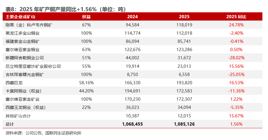 2025年矿产铜产量108.51万吨,同比 1.56%,25年矿产铜年度目标是 115万吨,25H1完成年度规划目标的94.36%。2025年,刚果(金)科卢韦齐铜矿、碧沙矿业、西藏巨龙、塞尔维亚紫金矿业、塞尔维亚紫金铜业等优质项目持续增量增效,分别同比增长24.78%、15.56%、16.53%、1.22%、0.50%。具体来看主要铜矿的生产进度,塞尔维亚的丘卡卢-佩吉铜金矿和博尔铜矿计划25年生产矿产铜29万吨,25年塞尔维亚完成年度目标的102.1%;科卢韦齐铜矿2025 年计划矿产铜11万吨,25年完成年度目标的107.3%;巨龙铜业2025年计划矿产铜17万吨,25年完成年度目标的114.1%,巨龙铜矿二期改扩建工程于2026年1月23日建成投产,达产后年矿产铜达30-35万吨,将成为中国最大的铜矿,2026年计划矿产铜30万吨;卡莫阿2025 年计划矿产铜 58万吨(100%权益),25年完成年度目标的67.1%,主要系刚果(金)卡莫阿-卡库拉铜矿的卡库拉矿段接连发生多次矿震,致使卡库拉矿段东区大面积被淹,井下采矿作业暂停,项目正加紧推进卡库拉矿段东区的排水及复产工作,2026年计划矿产铜38-42万吨;朱诺铜矿计划2026年底建成投产,规划达产后年矿产铜7.6万吨。