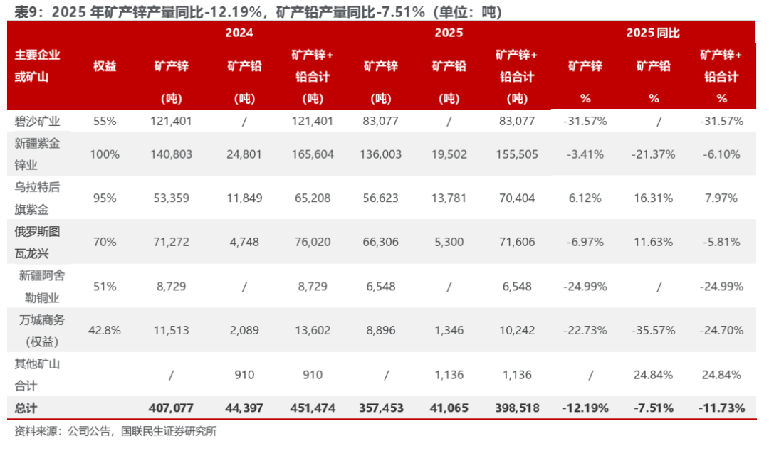 2025矿产锌产量35.75万吨,同比减少12.19%,矿产铅产量4.11万吨,同比减少7.51%。2025年公司矿产锌铅目标是44万吨,25公司矿产锌铅产量完成年度规划的90.57%。矿产锌方面,2025年新疆紫金锌业和碧沙矿业矿产锌产量分别变化-3.41%和-31.57%。具体来看主要铅锌矿的生产进度,碧沙锌(铜)矿2025年计划生产矿产锌 11 万吨,25H1完成年度目标的75.5%,2026年计划矿产锌9.1万吨、铜3万吨;紫金锌业乌拉根锌(铅)矿2025年计划生产矿产锌 14万吨、铅 2.2 万吨,25H1完成年度目标的97.1%、88.6%,2026年计划矿产锌13.4万吨、矿产铅1.8万吨。