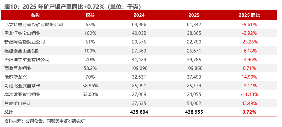 2025矿产银产量438.96吨,同比上升0.72%,25年矿产银年度规划是450吨,25年公司完成年度规划目标的97.55%。2025年公司共产银906.71吨,其中:冶炼副产银467.75吨,同比下降19.83%;矿山产银438.96吨,同比上升0.72%。随着巨龙铜矿、多宝山铜山铜矿等加速扩能投产,伴生矿产银产量将全面提升。
