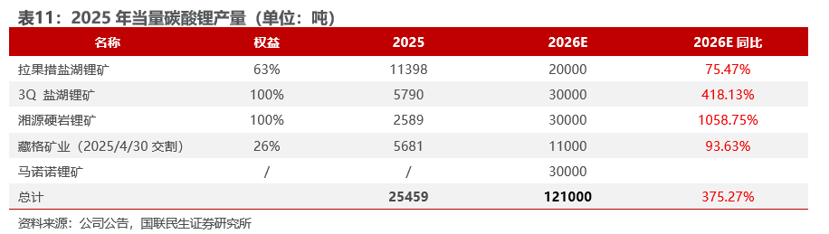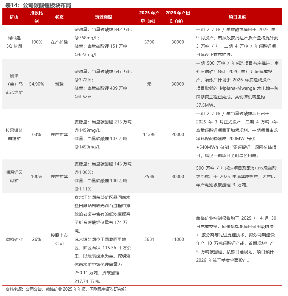 2025年产当量碳酸锂2.55万吨,2026年计划生产12万吨。2025年公司锂板块实现重大突破,拉果措盐湖锂矿、3Q 盐湖锂矿、湘源硬岩锂矿相继建成投产;马诺诺锂矿东北部项目建设稳步推进;藏格矿业控制权收购完成交割,公司产当量碳酸锂2.55万吨。2026年,现有项目稳步爬坡,马诺诺锂矿东北部项目拥有当量碳酸锂647万吨,一期500万吨/年采选项目有序推进,重介质选矿厂预计2026年6月底建成投产,冶炼厂计划于2026年底建成投产,2026年计划产当量碳酸锂3万吨。根据规划,公司2026年计划生产12万吨当量碳酸锂,2028年当量碳酸锂产量将提升至27-32 万吨。