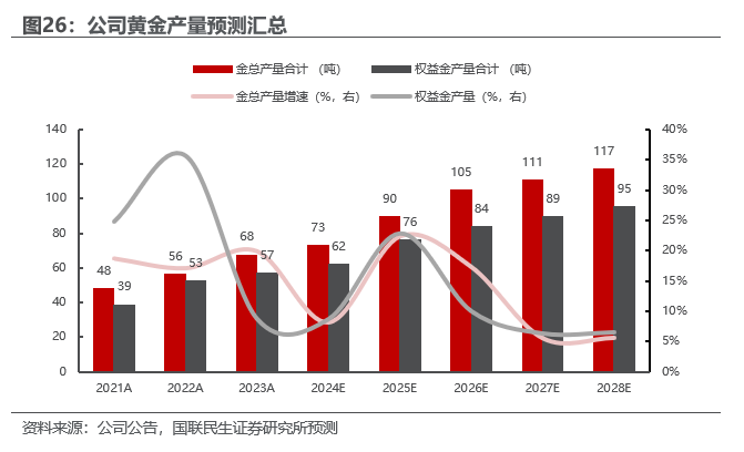 具体来看,公司计划2028年矿产金产量达到130-140吨(原100-110吨),矿产铜150-160万吨(跟原计划持平),矿产银600-700吨(跟原计划持平),矿产锌/铅40-45万吨(原计划55-60万吨),当量碳酸锂27-32万吨(原计划25-30万吨),矿产钼2.5-3.5万吨(跟原计划持平)。其中黄金目标大幅上调,主要或由于近两年黄金项目收购较多,公司2026年矿产金产量预期105吨,已经提前完成原先的2028年产量目标。主要增量主体或为紫金黄金国际。