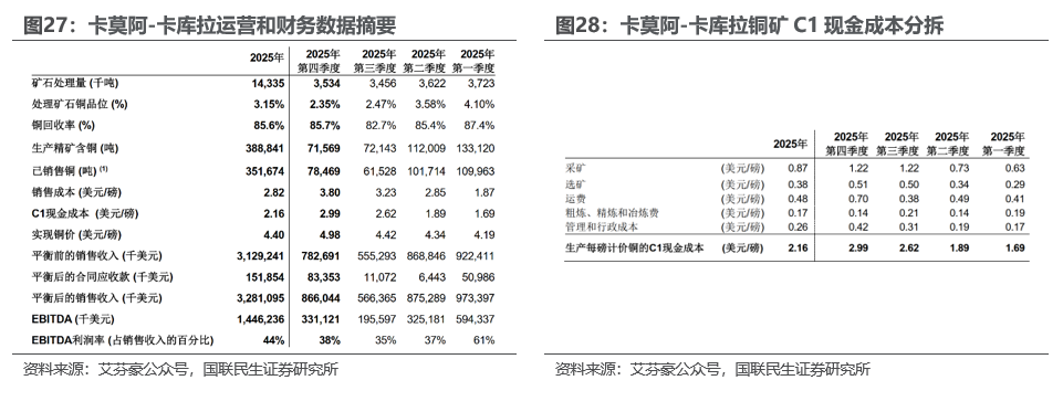 刚果金卡莫阿铜矿:二季度矿震影响生产,Q3和Q4入选品位和回收率下降,产量环比减少。根据艾芬豪公众号,2025Q4,卡莫阿–卡库拉 (Kamoa-Kakula) 处理353.4万吨矿石(入选品位下降至2.35%,铜回收率环比抬升3pct至85.7%),产铜7.16万吨,2025年全年共产铜38.9万吨,达到修订后的生产指导目标37万–42万吨铜区间。第四季度的C1现金成本上升,主要是因为运输含铜较低的产品和一次性管理和行政费用导致每磅物流成本增加,以及选厂入选品位较低导致采矿成本上升。第四季度销售精矿的铜品位较低,平均含铜33% (第三季度为43%),显示III期精矿销售的比例较高。III期出产的精矿含铜量通常在30%至35%之间,I期和II期出产的精矿含铜量则为40%至45%。