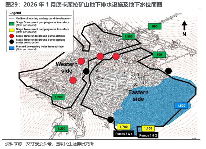 排水工作仍在进行,艾芬豪预计2026年第二季度将完成三阶段排水。2026年1月2日,公司宣布于2025年12月完成第二阶段抽水作业,第一组可以从地面操作的大功率水泵 (3号和4号水泵) 已完成排水工作。预计第三阶段排水作业将持续到2026年第二季度,尚待疏干的区域并非卡库拉恢复采矿作业的关键路径。第三阶段抽水作业包括重启受到水淹破坏的现有地下水平泵站以支持稳态生产。修复工作包括安装新的水泵电机、变电站和电缆。所有设备都已运抵现场。