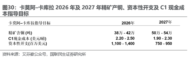 随着排水工作完成,艾芬豪预计卡莫阿-卡库拉铜矿2026年和2027年精矿含铜产量分别为38-42万吨和50-54万吨。C1现金成本分别为2.2-2.5美元/磅,1.9-2.3美元/磅。
