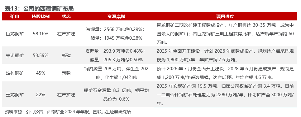 中国境内其他铜矿:紫金山铜金矿、多宝山铜矿、阿舍勒铜矿为公司境内骨干铜矿山,运营成熟稳定,管理效率高,成本低;其中铜山矿采矿地采工程已于 2025年4月投入生产,目前正积极推进铜山矿深部开发项目,项目建成后,预计可延长矿山服务年限40年;紫金山外围罗卜岭斑岩铜矿补充勘探及采矿证办理正加快推进,项目于 2025 年底完成可行性研究报告编制,正积极推进方案论证及各项前期手续办理,紫金山及外围正在开展新一轮地质找矿工作。