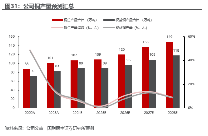 锂板块:“两湖两矿”实现产量突破。公司致力于成为全球最大的锂矿生产企业之一。2025年,公司锂板块实现重大突破,拉果措盐湖锂矿、3Q盐湖锂矿、湘源硬岩锂矿相继建成投产;马诺诺锂矿东北部项目建设稳步推进;藏格矿业控制权收购完成交割;公司产当量碳酸锂2.55万吨。根据规划,公司2028年当量碳酸锂产量将提升至27-32万吨。