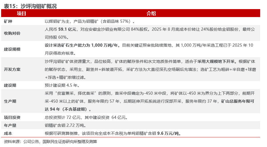 钼板块:2022年底,公司曾发布公告计划收购安徽沙坪沟钼矿84%权益,2025年8月底,公司以成本价转让24%金沙钼业股份给金钼股份。转让完成后,紫金矿业持股金沙钼业60%,金钼股份持股34%,沙坪沟钼矿的开发建设仍由紫金主导。同时计划由金沙钼业和金钼股份共同出资建设冶炼公司,金钼股份直接持股冶炼公司51%股份,剩下49%股份由金沙钼业持有,穿透来看,金钼股份合计持股冶炼公司67.66%股份。
