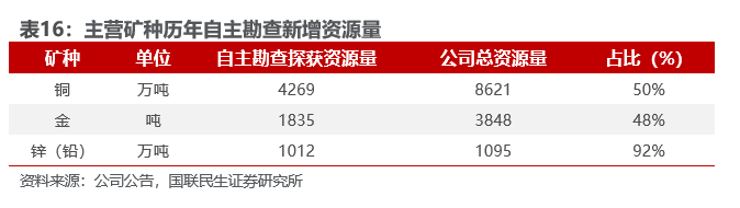 公司自主地质勘查具有行业竞争比较优势,单位勘查成本远低于全球行业平均水平。以既有矿山就矿找矿为重点,积极布局绿地、棕地矿产战略选区,实施风险勘查投资业务,自主勘查获得近50%的黄金、铜资源,超过90%的锌(铅)资源。