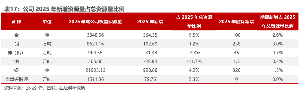 2025年公司共计投入权益地勘资金4.53亿元,年度勘查新增探明、控制和推断的权益资源量为:黄金100吨、铜258万吨、钨1.6万吨、钼1.5万吨、银320吨、锌(铅)45万吨,单位勘查成本远低于全球行业平均水平。公司自主找矿成果丰硕:①福建紫金山矿区东北矿段完成评审备案,累计探获铜资源量133万吨、钼资源量9万吨,为近20年来福建省探获的最大斑岩型铜钼矿。②苏里南罗斯贝尔高品位金矿化往深部继续延伸,估算新增金资源量21吨、平均品位1.2克/吨。③澳大利亚诺顿金田勘查新增金资源量15吨、平均品位3.09克/吨。④塞尔维亚博尔铜矿VK矿补勘,以及中国境内的铜山矿区、巨龙铜矿、知不拉铜矿等项目亦取得重要阶段性成果。