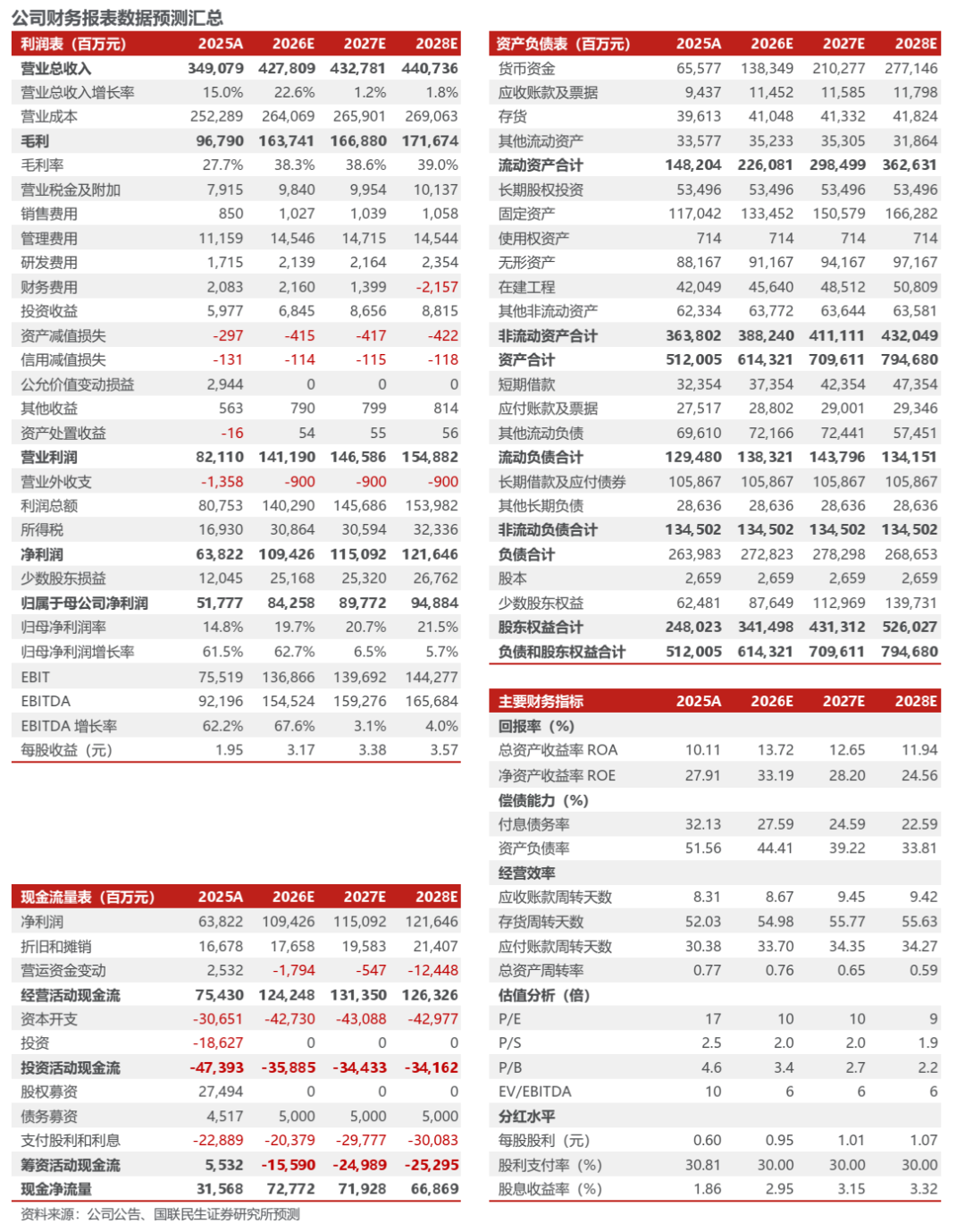 ◾事件:公司发布2025年报。2025年公司实现营业收入3490.8亿元,同比增长14.96%,归母净利润517.77亿元,同比增长61.55%,实现扣非归母净利润507.24亿元,同比增长60.05%。单季度看,25Q4公司实现营收948.80亿元,同比增长29.54%,环比增长9.70%,归母净利润139.14亿元,同比增长80.86%,环比减少4.52%,实现扣非归母净利润165.97亿元,同比增长108.89%,环比增长32.75%。扣非业绩超此前预告。