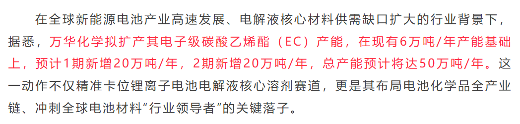 根据天天化工网报道,万华化学拟大举进入电解液溶剂赛道,继续卡位锂电池供应链。